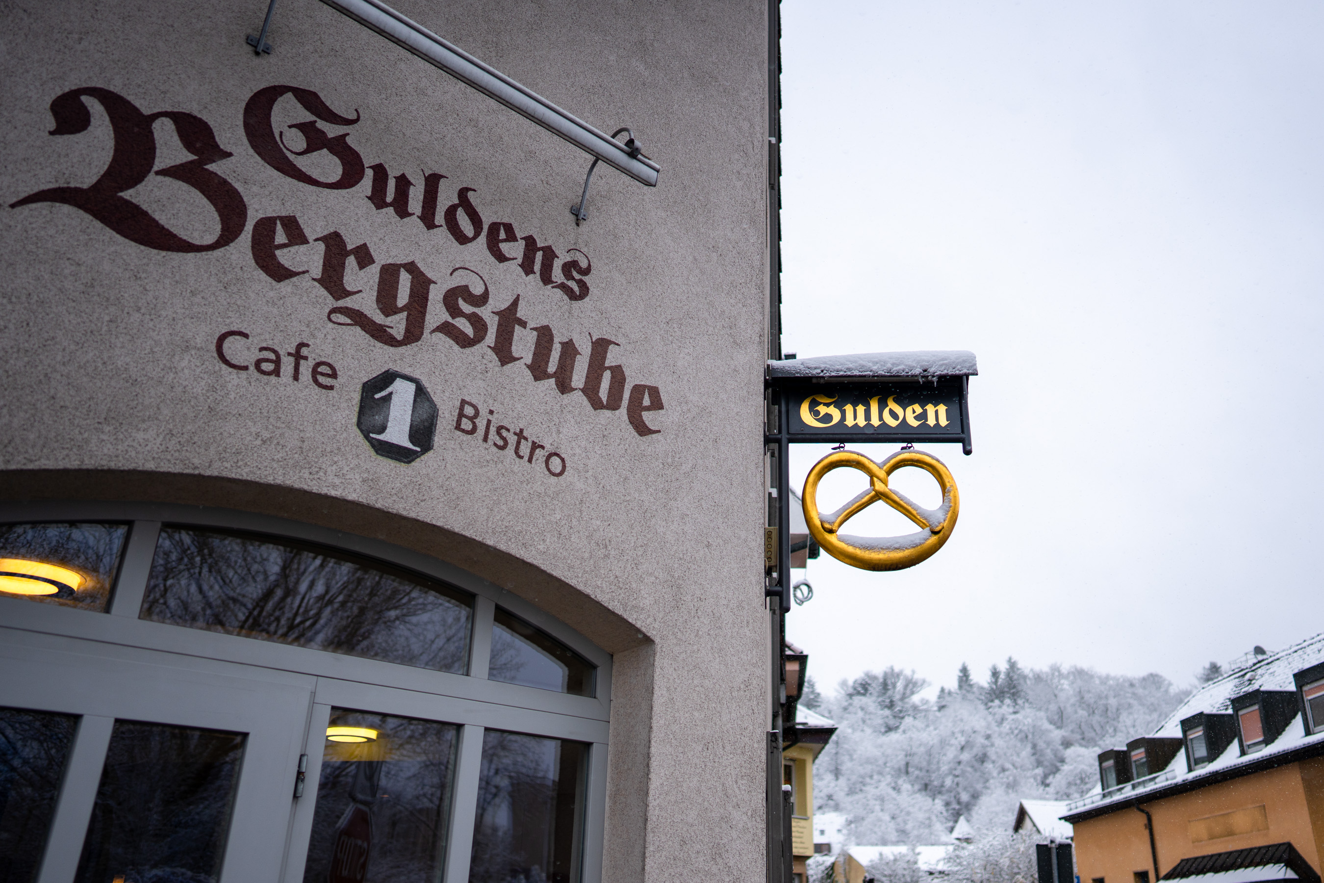 For early April, a very unusual sight of the golden pretzel from Gulden’s bakery and the Burgberg in Erlangen behind it. The low-pressure system Jana had brought snow with it.